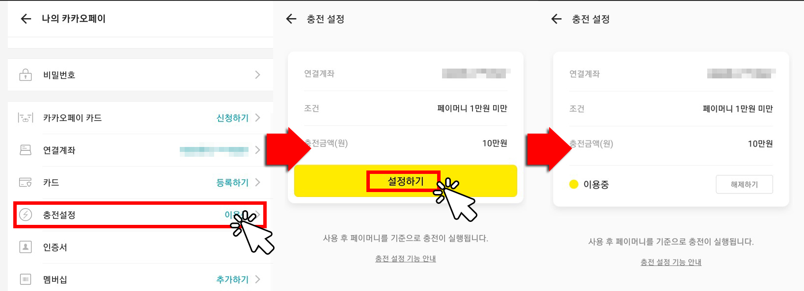 충전설정을 해주면 결제금액의 5%씩 현금으로 바로바로 적립해준다. 카카오페이 화면에서 톱니바퀴아이콘(환경설정)을 선택후 진입하면 충전설정이라는 부분이 보일것이다. 여기서 [설정하기] 만 눌러주면 이용중으로 바뀐다. 충전설정을 이용하면 결제금액의 5%씩 현금으로 적립해주는데 조건이 있다. 기본 충전금액 10만원이 있는데 10만원 미만으로 떨어지면 자동으로 10만원이 충전된다. 갑자기 10만원이 계좌에서 빠져 충전됐다고 걱정할 필요는 없다. 내 은행계좌로 언제든지 다시 출금할 수 있다.