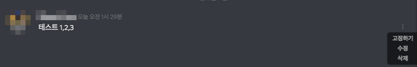 그리고 서버를 운영하면서 유용한 기능 중 하나는 고정하기 기능이다. 이 기능은 각 채널의 공지처럼 등록을 할수가 있다. 채팅 내용중에 고정하고 싶은 내용이 있다면 채팅글의 우측에 [쩜쩜쩜]을 클릭 후 고정하기를 눌러주면 된다. 고정하기를 해주면 채널 상단의 핀 아이콘을 클릭했을때 이 고정된 채팅 내용을 수시로 확인할 수 있다.